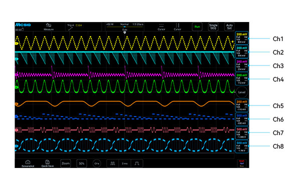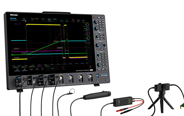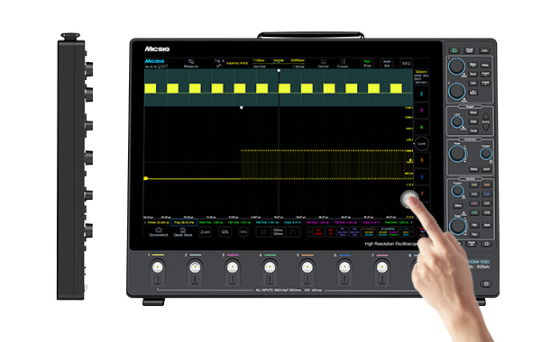 The MHO high-resolution oscilloscope 6 series features a 1 GHz bandwidth, a 6 GSa/s sampling rate, 8 analogue channels, a storage depth of 1,800 million points (Mpts), and a 12-bit vertical resolution. Its high bandwidth and 8-channel capability are suitable for faster circuit analysis and more synchronised signal testing. Its ultra-thin design at 3.76 cm can save a lot of your precious desk space; a 16-inch touch screen with a resolution of 1920*1200 provides a super-clear waveform display for a more comfortable visual experience.