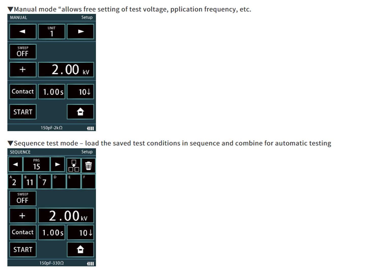- Test Modes: Standard, Manual, and Sequence