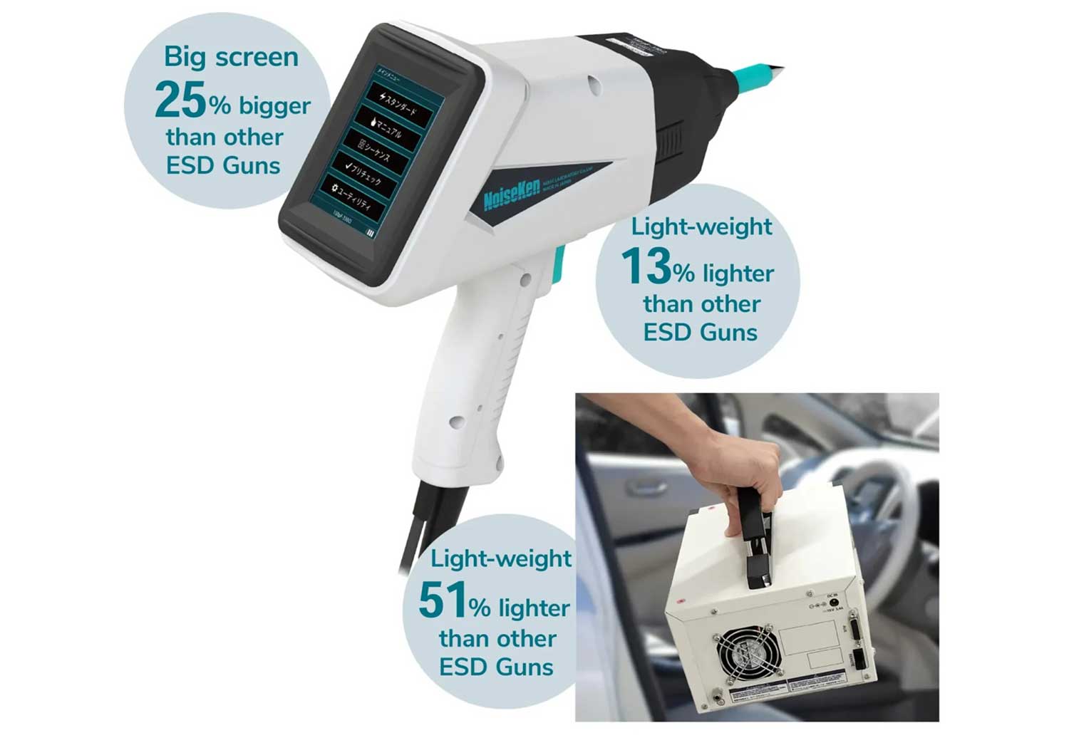 - The discharge gun features an LCD touch panel for improved operability and direct parameter control.