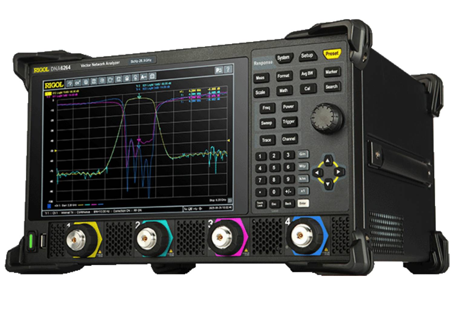 The Rigol DNA6204 vector network analyser provides various calibration methods such as frequency response, single-port, response isolation, enhanced response, full dual-port, and electronic calibration. It supports various display formats such as Log Mag, Lin Mag, SWR, Phase, Group Delay, Smith Chart, and Polar Chart. Through the connectivity with the instrument under test via the standard interfaces such as USB, LAN, and HDMI, this series can accurately measure the amp/ freq characteristics, phase/freq characteristics, and group delay characteristics of the microwave network.